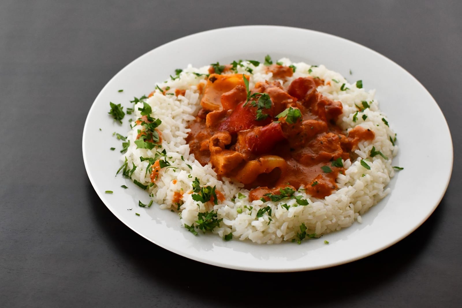 carne de pui, sos chilly, ceapă roșie, legume, orez